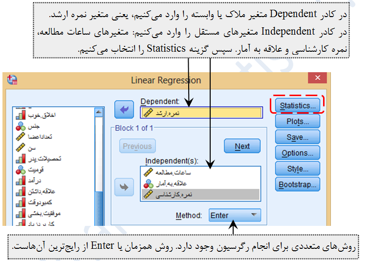 اگر تنها دو متغیر مستقل وجود داشت از روش همبستگی پیرسون استفاده می کردیم و چنانچه ضریب همبستگی بین دو متغیر مستقل بیشتر از 0/7 بود نشان از وجود هم خطّی بین متغیرهای مستقل داشت و باید تنها یکی از متغیرهای مستقل را در تحلیل رگرسیون استفاده می کردیم. اما در مثال کتاب سه متغیر مستقل داریم و بهتر است از دستور بررسی هم خطّی چندگانه که در دستور رگرسیون خطّی وجود دارد استفاده کنیم. می خواهیم بررسی کنیم که آیا مسأله هم خطّی چندگانه بین سه متغیر مستقل یا پیش بینِ تعداد ساعات مطالعه، علاقه به درس آمار و نمره درس SPSS (کارشناسی) وجود دارد یا خیر.