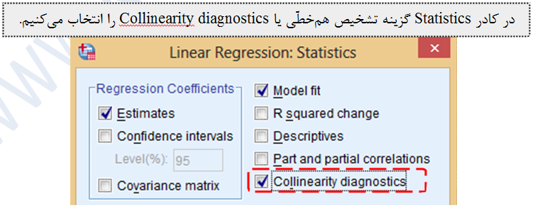 از میان خروجی ها و جداول ارائه شده، جدول ضرایب را جهت بررسی هم خطّی متغیرهای مستقل بررسی می کنیم. در این جدول نتایج ستون آماره تحمّل یا تولرانس نشان دهنده میزان هم خطّی متغیرهای مستقل است.